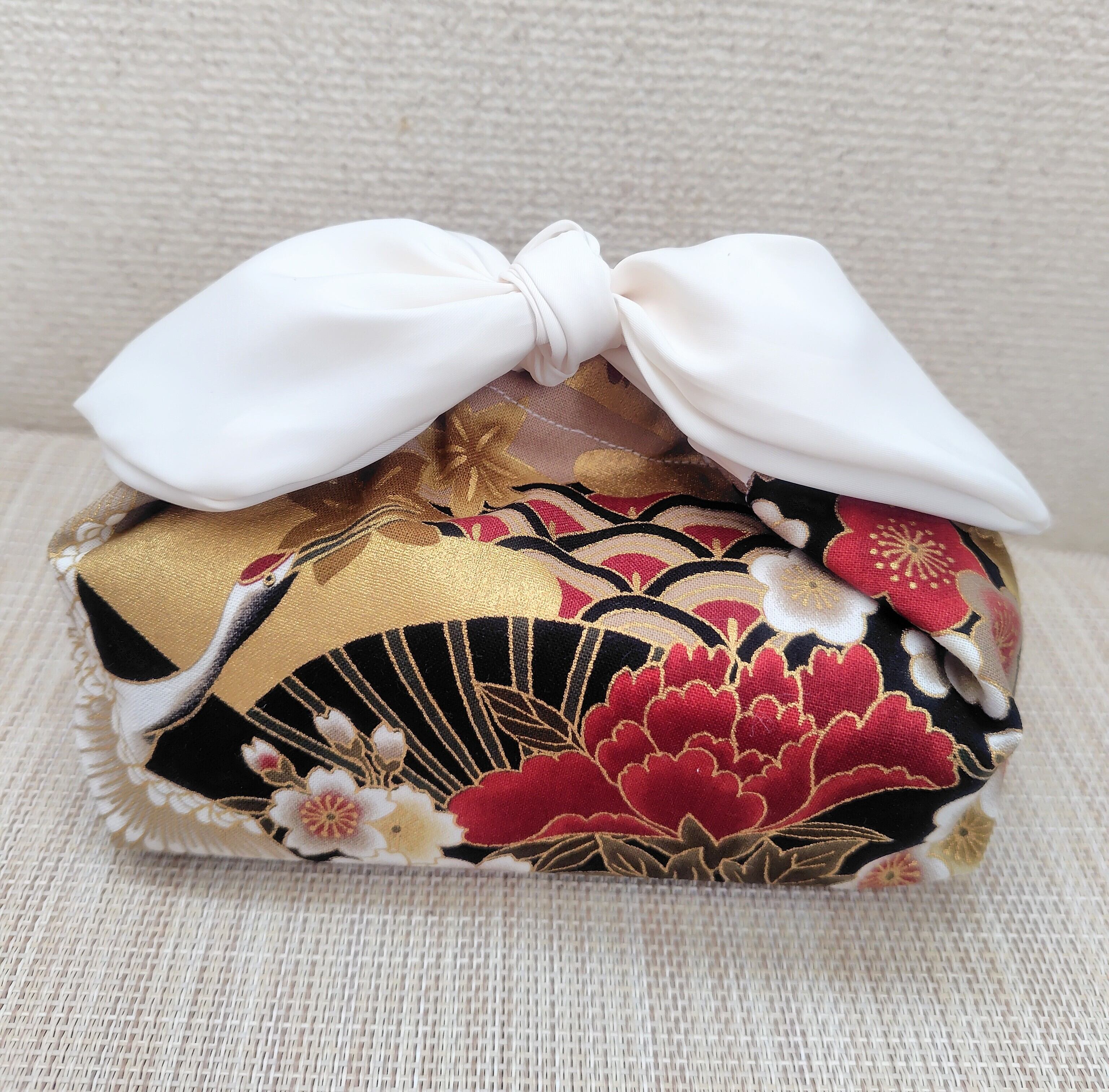 このお弁当袋は、華やかな和柄と大きなリボンが特徴の魅力的なアイテムで、日常使いはもちろん、ピクニックや運動会など特別なシーンでも大活躍します。優雅なデザインが、あなたのランチタイムを彩ります!お弁当をしっかりと包みこみながら、持ち運びしやすいのも嬉しいポイントです。