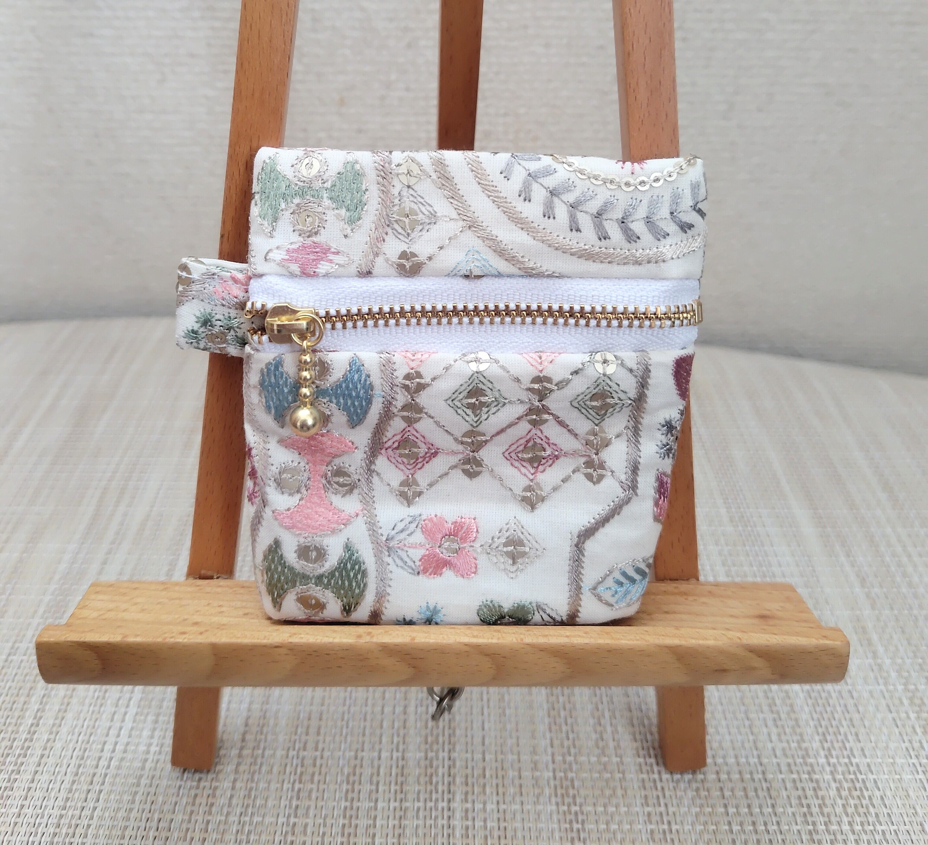 このミニポーチは、鮮やかなインド刺繍が施されたデザインが特徴の魅力的なアイテムで、日常使いやお出かけにぴったりです。美しい刺繍があなたのスタイルにエスニックなアクセントを加えます!コンパクトながら、必要なアイテムをしっかり収納できるのが嬉しいポイントです。